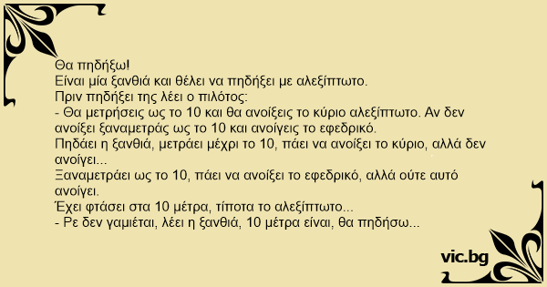 - Ρε δεν γαμιέται, λέει η ξανθιά, 10 μέτρα είναι, θα πηδήσω...