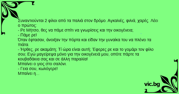 Συναντιούνται 2 φίλοι από τα παλιά στον δρόμο. Αγκαλιές, φιλιά, χαρές. Λέει ο πρώτος: