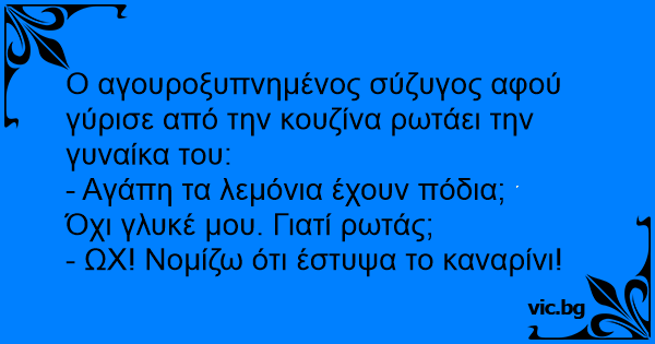 Ρωτάει ο Κωστίκας την γυναίκα του: - Ρε Σουμέλα τα λεμόνια έχουν πόδια; - Όχι. - Γαμώτο πάλι το καναρίνι έστυψα!