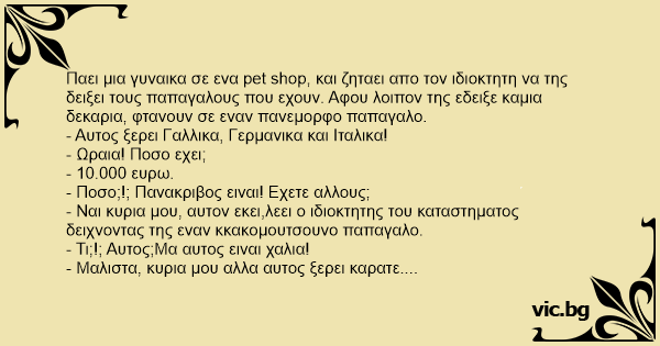 Παει μια γυναικα σε ενα pet shop, και ζηταει απο τον ιδιοκτητη να της δειξει τους παπαγαλους που εχουν. Αφου λοιπον της εδειξε καμια δεκαρια, φτανουν σε εναν πανεμορφο παπαγαλο.