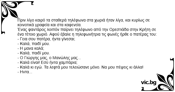 Ένας φαντάρος λοιπόν παίρνει τηλέφωνο από την Ορεστιάδα στην Κρήτη σε ένα τέτοιο χωριό. Αφού έβαλε η τηλεφωνήτρια τις φωνές ήρθε ο πατέρας του: