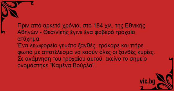 Σε ανάμνηση του τροχαίου αυτού, εκείνο το σημείο ονομάστηκε "Kαμένα Βούρλα".
