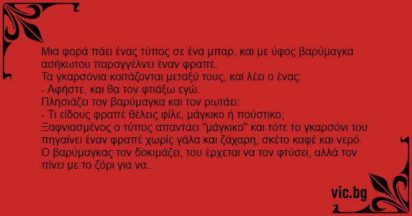 Ξαφνιασμένος ο τύπος απαντάει "μάγκικο" και τότε το γκαρσόνι του πηγαίνει έναν φραπέ χωρίς γάλα και ζάχαρη, σκέτο καφέ και νερό.