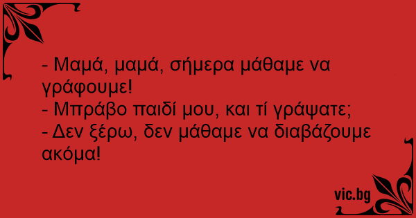 - Pappa, pappa, vi har lärt oss att skriva! - Vad skriver ni då? - Vet inte, vi har inte lärt oss att läsa än.
