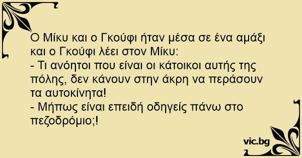 Ο Μίκυ και ο Γκούφι ήταν μέσα σε ένα αμάξι και ο Γκούφι λέει στον Μίκυ: