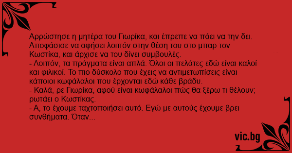 Αρρώστησε η μητέρα του Γιωρίκα, και έπρεπε να πάει να την δει. Αποφάσισε να αφήσει λοιπόν στην θέση του στο μπαρ τον Κωστίκα, και άρχισε να του δίνει συμβουλές.