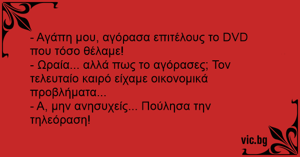 - Αγάπη μου, αγόρασα επιτέλους το DVD που τόσο θέλαμε!<br />- Ωραία... αλλά πως το αγόρασες; Τον τελευταίο καιρό είχαμε οικονομικά προβλήματα...<br />- Α, μην ανησυχείς... Πούλησα την τηλεόραση!