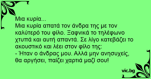 Μια κυρία απατά τον άνδρα της με τον καλύτερό του φίλο. Ξαφνικά το τηλέφωνο χτυπά και αυτή απαντά. Σε λίγο κατεβάζει το ακουστικό και λέει στον φίλο της: