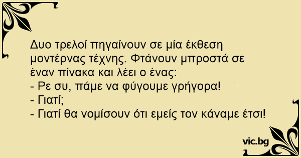 Δυο τρελοί πηγαίνουν σε μία έκθεση μοντέρνας τέχνης. Φτάνουν μπροστά σε έναν πίνακα και λέει ο ένας: