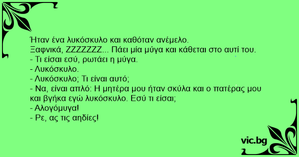 - Να, είναι απλό: Η μητέρα μου ήταν σκύλα και ο πατέρας μου και βγήκα εγώ λυκόσκυλο. Εσύ τι είσαι;
