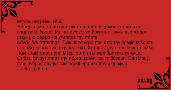 Κανείς δεν απάντησε. Ένιωθε το νερό που από την οροφή κυλούσε στο σβέρκο του ενώ περίμενε εκεί. Χτύπησε ξανά, πιο δυνατά, αλλά πάλι καμιά απάντηση. Μέχρι αυτή τη στιγμή βράχηκε εντελώς. Οπότε, ξαναχτύπησε την πόρτα με όλη του τη δύναμη. Επιτέλους, ένας άνδρας φάνηκε στο παράθυρο του πάνω ορόφου.