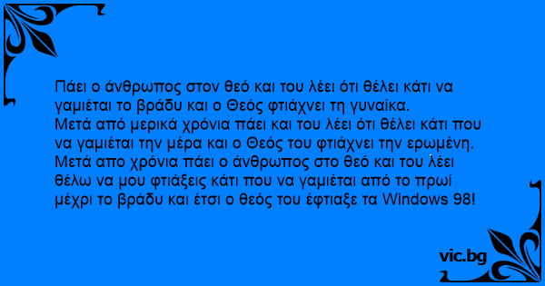Πάει ο άνθρωπος στον θεό και του λέει ότι θέλει κάτι να γαμιέται το βράδυ και ο Θεός φτιάχνει τη γυναίκα. Μετά από μερικά χρόνια πάει και του λέει ότι θέλει κάτι που να γαμιέται την μέρα και ο Θεός του φτιάχνει την ερωμένη. Μετά απο χρόνια πάει ο άνθρωπος στο θεό και του λέει θέλω να μου φτιάξεις κάτι που να γαμιέται από το πρωί μέχρι το βράδυ και έτσι ο θεός του έφτιαξε τα Windows 98!
