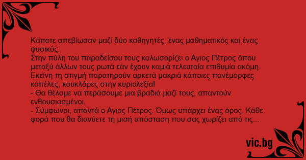 - Σύμφωνοι, απαντά ο Αγιος Πέτρος. Όμως υπάρχει ένας όρος. Κάθε φορά που θα διανύετε τη μισή απόσταση που σας χωρίζει από τις κοπέλες θα σταματάτε για λίγο.