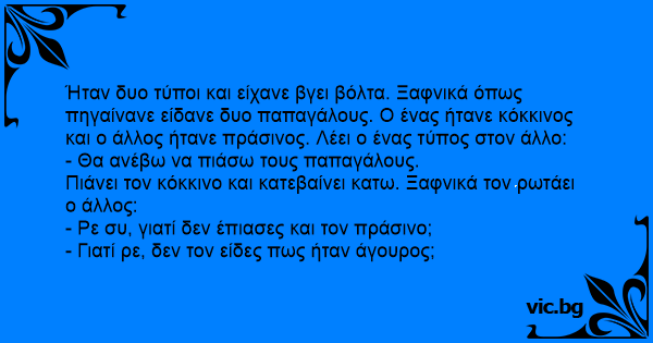 Ήταν δυο τύποι και είχανε βγει βόλτα. Ξαφνικά όπως πηγαίνανε είδανε δυο παπαγάλους. Ο ένας ήτανε κόκκινος και ο άλλος ήτανε πράσινος. Λέει ο ένας τύπος στον άλλο: