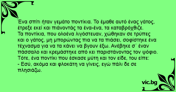 Ένα σπίτι ήταν γεμάτο ποντίκια. Το έμαθε αυτό ένας γάτος, έτρεξε εκεί και πιάνοντάς τα ένα-ένα, τα καταβρόχθιζε.