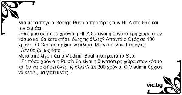 - Θεέ μου σε πόσα χρόνια η ΗΠΑ θα είναι η δυνατότερη χώρα στον κόσμο και θα κατακτήσει όλες τις άλλες? Απαντά ο Θεός σε 100 χρόνια. Ο George άρχισε να κλαίει. Μα γιατί κλαις Γεώργιε;