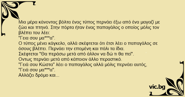 Μια μέρα κάνοντας βόλτα ένας τύπος περνάει έξω από ένα μαγαζί με ζώα και πτηνά. Στην πόρτα ήταν ένας παπαγάλος ο οποίος μόλις τον βλέπει του λέει: