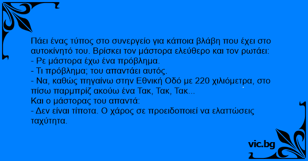 Πάει ένας τύπος στο συνεργείο για κάποια βλάβη που έχει στο αυτοκίνητό του. Βρίσκει τον μάστορα ελεύθερο και τον ρωτάει: