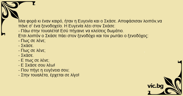 Μια φορά κι έναν καιρό, ήταν η Ευγενία και ο Σκάσε. Αποφάσισαν λοιπόν,να πάνε σ ένα ξενοδοχείο. Η Ευγενία λέει στον Σκάσε:
