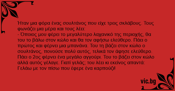 - Όποιος μου φέρει το μεγαλύτερο λαχανικό της περιοχής, θα του το βάλω στον κώλο και θα τον αφήσω ελεύθερο. Πάει ο πρώτος και φέρνει μια μπανάνα. Του τη βάζει στον κώλο ο σουλτάνος, πονούσε πολύ αυτός, τελικά τον άφησε ελεύθερο. Πάει ο 2ος φέρνει ένα μεγάλο αγγούρι. Του το βάζει στον κώλο αλλά αυτός γέλαγε. Γιατί γελάς; του λέει κι εκείνος απαντά: Γελάω με τον πίσω που έφερε ένα καρπούζι!
