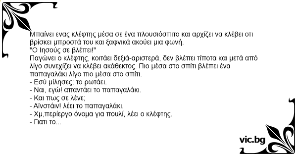 Μπαίνει ένας κλέφτης νύχτα σε ένα σπίτι. Αρχίζει με τον φακό να ψάχνει κάτι πολύτιμο. Ξαφνικά ακούει μια φωνή: - Ο Ιησούς σε προσέχει! Ταραγμένος ψάχνει με τον φακό γύρω του αλλά δεν βλέπει τίποτα....