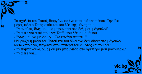 Νευριάζει η μάνα του Τοτού και του δίνει ένα δεξί direct στο μάγουλο. Μετά από λίγο, πηγαίνει στον πατέρα του ο Τοτός και του λέει: