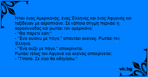Ήταν ένας Αμερικανός, ένας Έλληνας και ένας Αφγανός και ταξίδευαν με αεροπλάνο. Σε κάποια στιγμή περνάει η αεροσυνοδός και ρωτάει τον αμερικάνο: