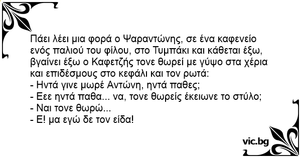 Πάει λέει μια φορά ο Ψαραντώνης, σε ένα καφενείο ενός παλιού του φίλου, στο Τυμπάκι και κάθεται έξω, βγαίνει έξω ο Καφετζής τονε θωρεί με γύψο στα χέρια και επιδέσμους στο κεφάλι και τον ρωτά:
