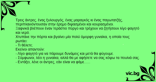 - Σύμφωνοι, λέει η γυναίκα, αλλά θα με αφήσετε να σας κόψω τα πουλιά σας.