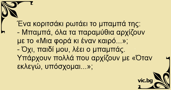 - Μπαμπά, όλα τα παραμύθια αρχίζουν με το «Μια φορά κι έναν καιρό...»;
