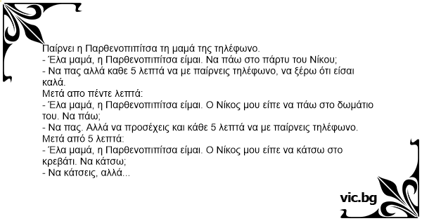- Έλα μαμά, η Παρθενοπιπίτσα είμαι. Να πάω στο πάρτυ του Νίκου;