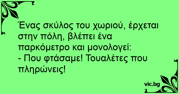 Ένας σκύλος του χωριού, έρχεται στην πόλη, βλέπει ένα παρκόμετρο και μονολογεί: