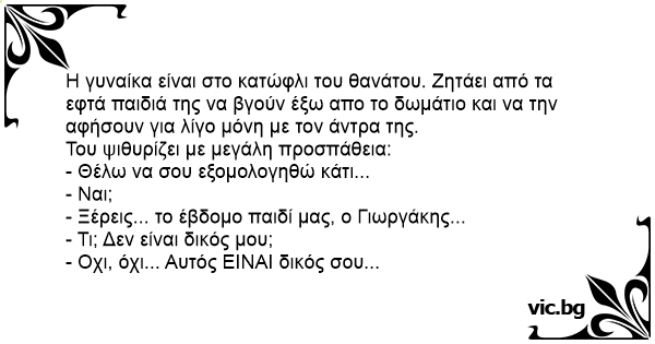 H γυναίκα είναι στο κατώφλι του θανάτου. Ζητάει από τα εφτά παιδιά της να βγούν έξω απο το δωμάτιο και να την αφήσουν για λίγο μόνη με τον άντρα της.