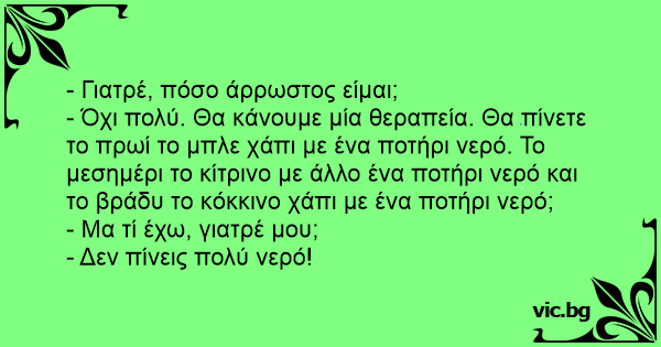 - Όχι πολύ. Θα κάνουμε μία θεραπεία. Θα πίνετε το πρωί το μπλε χάπι με ένα ποτήρι νερό. Το μεσημέρι το κίτρινο με άλλο ένα ποτήρι νερό και το βράδυ το κόκκινο χάπι με ένα ποτήρι νερό;