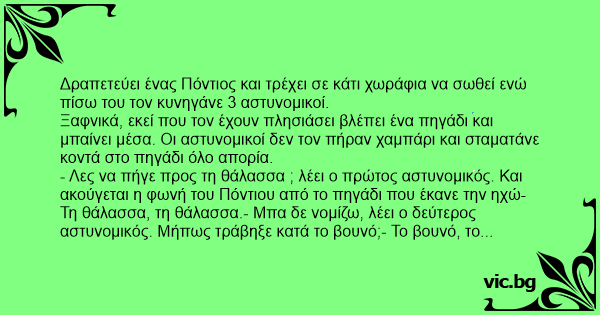 - Λες να πήγε προς τη θάλασσα ; λέει ο πρώτος αστυνομικός. Και ακούγεται η φωνή του Πόντιου από το πηγάδι που έκανε την ηχώ- Τη θάλασσα, τη θάλασσα.- Μπα δε νομίζω, λέει ο δεύτερος αστυνομικός. Μήπως τράβηξε κατά το βουνό;- Το βουνό, το βουνό (ξανακούγεται η φωνή του Πόντιου)- Όχι ρε παιδιά λέει ο τρίτος αστυνομικός. Λέτε να ψάξουμε στο πηγάδι;Κι ακούγεται ξανά η φωνή του Πόντιου- Στο βουνό, στο βουνό!