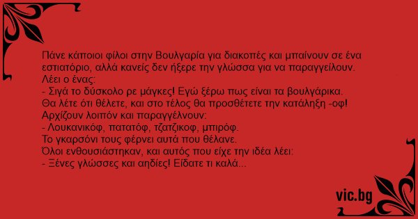 Πάνε κάποιοι φίλοι στην Βουλγαρία για διακοπές και μπαίνουν σε ένα εστιατόριο, αλλά κανείς δεν ήξερε την γλώσσα για να παραγγείλουν.