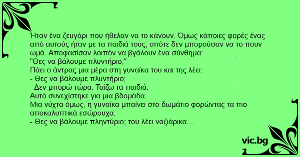 - Θες να βάλουμε πληντύριο; του λέει ναζιάρικα. Ο άντρας βαριεστημένος, της απαντάει: