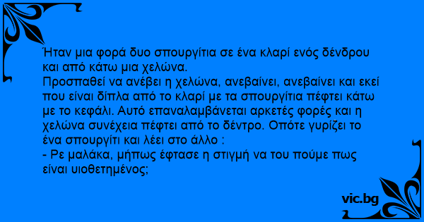 Προσπαθεί να ανέβει η χελώνα, ανεβαίνει, ανεβαίνει και εκεί που είναι δίπλα από το κλαρί με τα σπουργίτια πέφτει κάτω με το κεφάλι. Αυτό επαναλαμβάνεται αρκετές φορές και η χελώνα συνέχεια πέφτει από το δέντρο. Οπότε γυρίζει το ένα σπουργίτι και λέει στο άλλο :