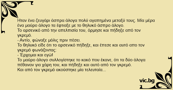 Ηταν ένα ζευγάρι άσπρα άλογα πολύ αγαπημένα μεταξύ τους. Μία μέρα ένα μαύρο άλογο τα έφτιαξε με το θηλυκό άσπρο άλογο.