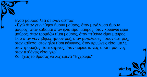 - Εγώ όταν γεννήθηκα ήμουν μαύρος, όταν μεγάλωσα ήμουν μαύρος, όταν κάθομαι στον ήλιο είμαι μαύρος, όταν κρυώνω είμαι μαύρος, όταν τρομάζω είμαι μαύρος, όταν πεθάνω είμαι μαύρος...