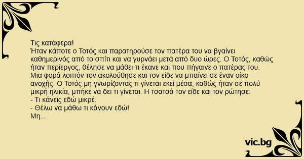 Ήταν κάποτε ο Τοτός και παρατηρούσε τον πατέρα του να βγαίνει καθημερινός από το σπίτι και να γυρνάει μετά από δυο ώρες. Ο Τοτός, καθώς ήταν περίεργος, θέλησε να μάθει τι έκανε και που πήγαινε ο πατέρας του.