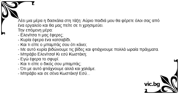 Λέει μια μέρα η δασκάλα στη τάξη: Aύριο παιδιά μου θα φέρετε όλοι σας από ένα εργαλείο και θα μας πείτε σε τι χρησιμεύει.