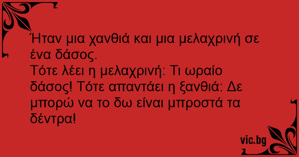 Τότε λέει η μελαχρινή: Τι ωραίο δάσος! Τότε απαντάει η ξανθιά: Δε μπορώ να το δω είναι μπροστά τα δέντρα!