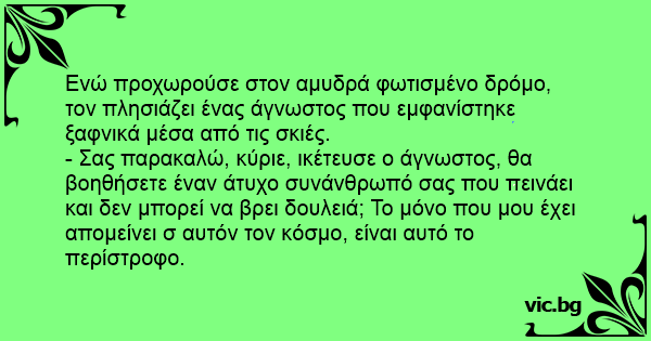 - Σας παρακαλώ, κύριε, ικέτευσε ο άγνωστος, θα βοηθήσετε έναν άτυχο συνάνθρωπό σας που πεινάει και δεν μπορεί να βρει δουλειά; Το μόνο που μου έχει απομείνει σ αυτόν τον κόσμο, είναι αυτό το περίστροφο.