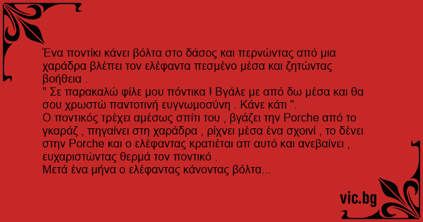 Ένα ποντίκι κάνει βόλτα στο δάσος και περνώντας από μια χαράδρα βλέπει τον ελέφαντα πεσμένο μέσα και ζητώντας βοήθεια .
