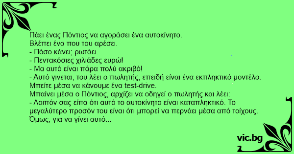 Πάει ένας Πόντιος να αγοράσει ένα αυτοκίνητο. Βλέπει ένα που του αρέσει. - Πόσο κάνει; ρωτάει. - Πεντακόσιες χιλιάδες ευρώ! - Μα αυτό είναι πάρα πολύ ακριβό! - Αυτό γινεται, του λέει ο πωλητής, επειδή είναι ένα εκπληκτικό μοντέλο. Μπείτε μέσα να κάνουμε ένα test-drive. Μπαίνει μέσα ο Πόντιος, αρχίζει να οδηγεί ο πωλητής και λέει: - Λοιπόν σας είπα ότι αυτό το αυτοκίνητο είναι καταπληκτικό. Το μεγαλύτερο προσόν του είναι ότι μπορεί να περνάει μέσα από τοίχους. Όμως, για να γίνει αυτό πρέπει να έχετε κλειστά τα μάτια. Ο Πόντιος εντυπωσιάζεται από αυτό. - Σοβαρά περνάει μέσα από τοίχους; - Και βέβαια, λέει ο πωλητής. Να, κλείστε τα μάτια σας, και θα περάσουμε μέσα από τον τοίχο που βλέπετε. Κλείνει τα μάτια ο Πόντιος, και ο πωλητής κάνει στροφή και αποφεύγουν τον τοίχο. Πείθεται ο Πόντιος και εντυπωσιασμένος, πληρώνει όσο-όσο για το αυτοκίνητο και φεύγει χαρούμενος. Πάει στο σπίτι, και λέει στην οικογένειά του: - Αγόρασα ένα καταπληκτικό αυτοκίνητο, που αν οι επιβάτες έχουν κλειστά τα μάτια περνάει και μέσα από τοίχους. Ελάτε να το δοκιμάσουμε. Μπαίνουν όλοι μέσα στο αυτοκίνητο, ξεκινάνε, πλησιάζουν έναν τοίχο... - Τώρα! λέει ο Πόντιος. Κλείστε όλοι τα μάτια! Παίρνει φόρα και ρίχνει το αυτοκίνητο στον τοίχο! Το αυτοκίνητο στραπατσάρεται, και γυρνά ο Πόντιος και λέει: - Αν πιάσω στα χέρια μου αυτόν που δεν έκλεισε τα μάτια του...
