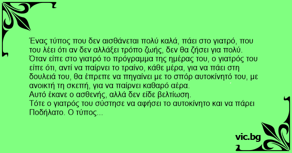 Ένας τύπος που δεν αισθάνεται πολύ καλά, πάει στο γιατρό, που του λέει ότι αν δεν αλλάξει τρόπο ζωής, δεν θα ζήσει για πολύ.