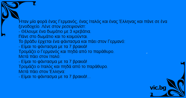 Ήταν μία φορά ένας Γερμανός, ένας Ιταλός και ένας Έλληνας και πάνε σε ένα ξενοδοχείο. Λένε στον ρεσεψιονίστ: