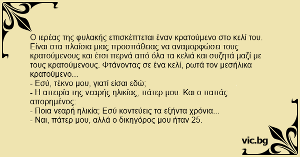 - Η απειρία της νεαρής ηλικίας, πάτερ μου. Και ο παπάς απορημένος: