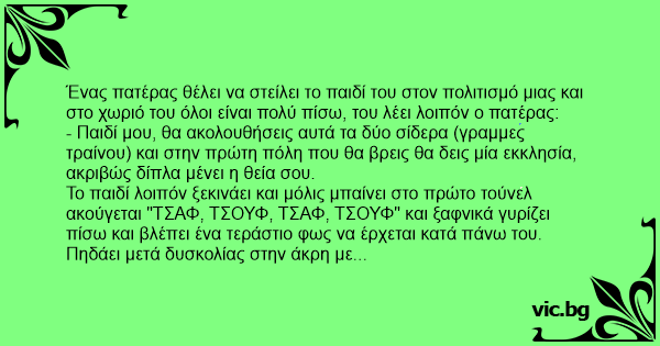 Ένας πατέρας θέλει να στείλει το παιδί του στον πολιτισμό μιας και στο χωριό του όλοι είναι πολύ πίσω, του λέει λοιπόν ο πατέρας: